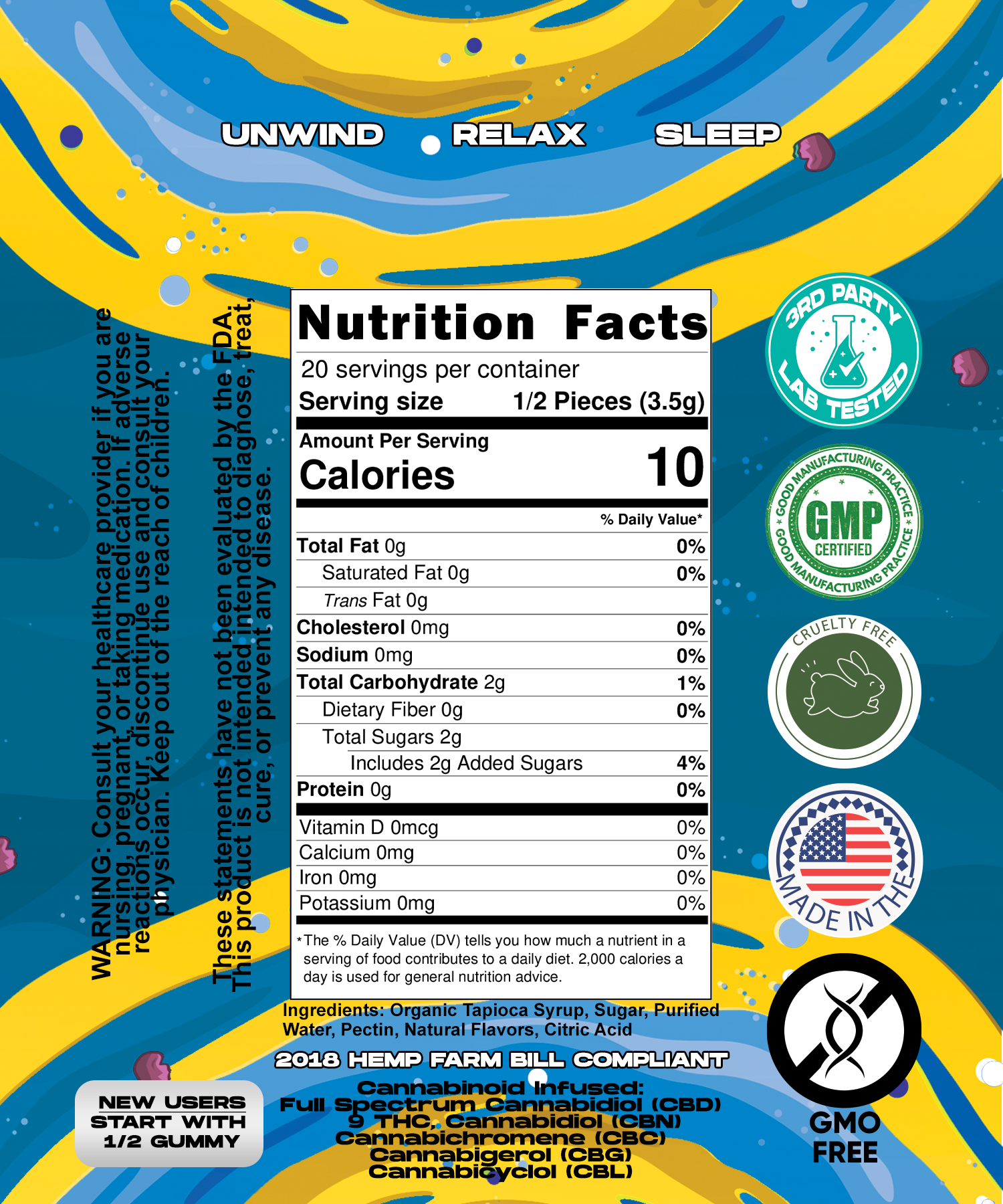 Each delectable gummy encapsulates a perfect harmony of 10mg Delta-9 THC, CBD, CBG, CBC, and CBN, working in synergy to unlock a world of relief and relaxation. Each gummy provides 130mg of CBD.